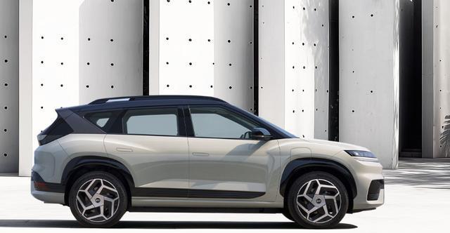 车型侧面,匹配了18英寸的不规则轮毂,就像旋转的花瓣一样。除此之外,还拥有双色车身,悬浮式的车顶以及隐藏样式的电动把手设计。值得一提的是,我们看到了一个反光镜上搭载了两个摄像头,其实这足以说明这款现代EO 羿欧有着比较全面的智驾以及360度全景影像系统。尾部同样与同车头部分进行了呼应,搭载了贯穿样式的数码尾灯设计。车身数据部分,这款现代EO 羿欧的长宽高分别为4615/1875/1700mm,轴距是2750mm,这是一款紧凑型SUV。
